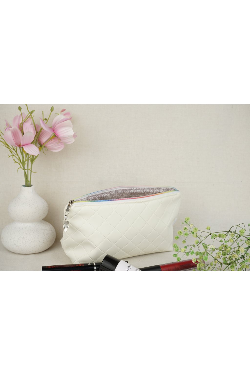 Biela prešívaná kozmetická taštička s dúhovým zipsom