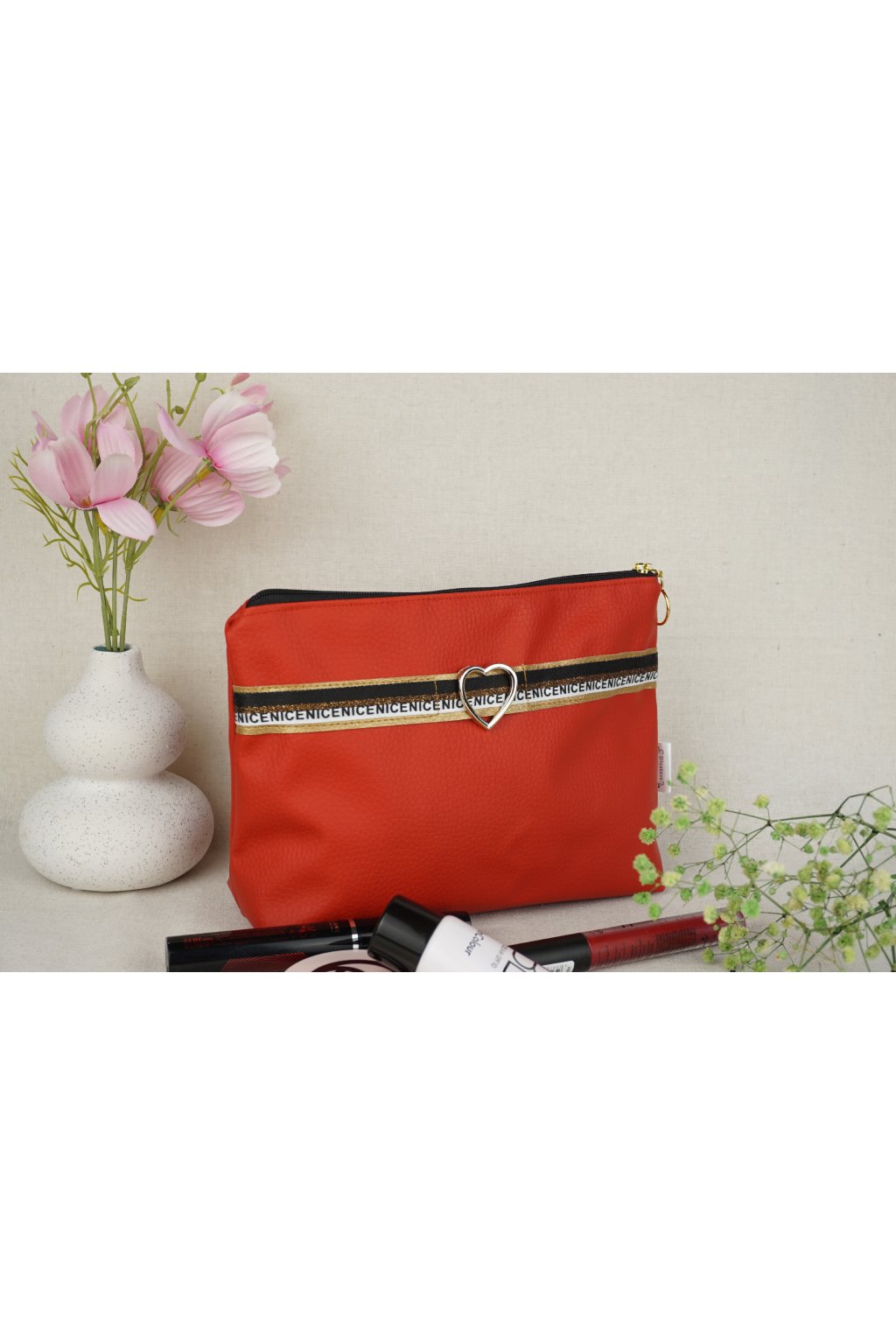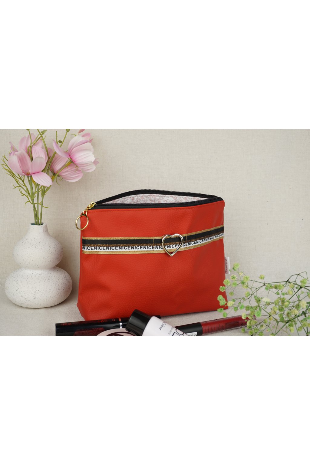 Toto dizajnové puzdro na make-up je vyrobené z kvalitnej červenej koženky (ekokože), ktorá je príjemná na dotyk a zároveň praktická na údržbu. Dominantným prvkom je čierno-zlatý ozdobný popruh s nápisom "NICE", ktorý je elegantne spojený kovovým srdcom v zlatej farbe. Táto kombinácia vytvára luxusný a neprehliadnuteľný doplnok.