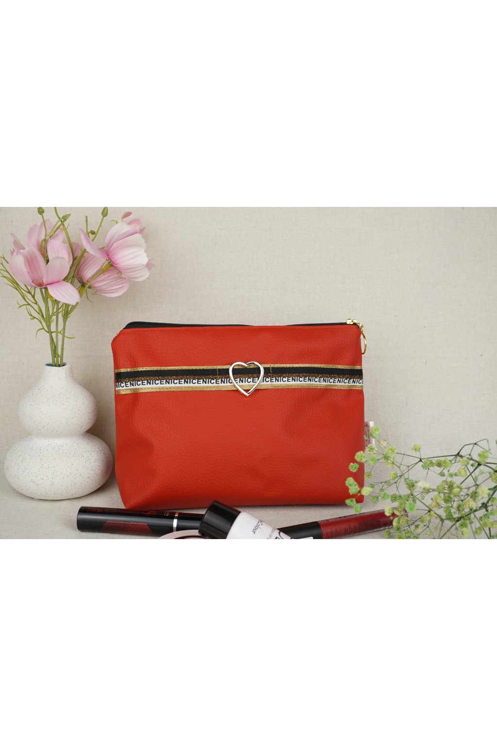 Hľadáte štýlovú a modernú kozmetickú taštičku, ktorá je viac než len obyčajné puzdro? Naša červená koženková taštička s dizajnovým popruhom a ozdobou v tvare srdca je odvážnym doplnkom na organizáciu vašej kozmetiky a zároveň perfektne poslúži ako malá listová kabelka na večer.