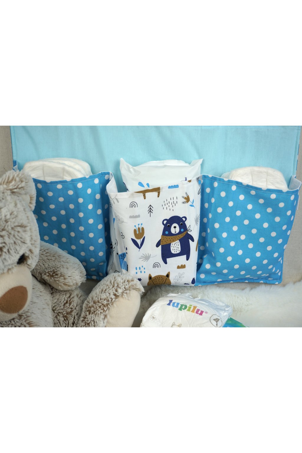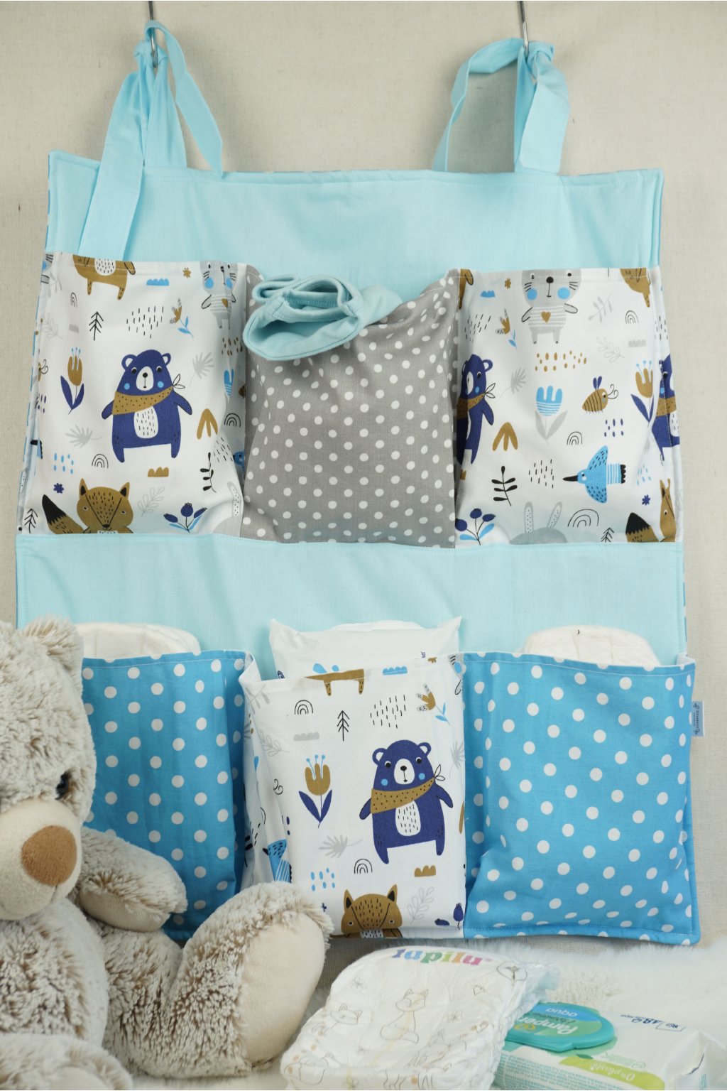 - UNIVERZÁLNE ZAVESENIE: Vďaka praktickým uväzovacím šnúrkam organizér ľahko a bezpečne pripevníte na detskú postieľku, na stenu nad prebaľovací pult alebo na dvere.